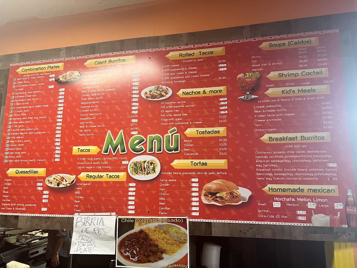 From a reviewer’s perspective, Armando’s #2 offers a broad and satisfying menu that captures the essence of classic Mexican comfort food, even if specific prices aren’t listed. The Combination Plates-featuring options like 2 Beef Tacos, Enchilada & Bean Tostada, and Enchilada & Beef Burrito-provide hearty, well-rounded meals. Their Giant Burritos, such as the Texas Burrito, California Burrito, and Carne Asada Burrito, stand out for their generous portions and bold flavors. Taco lovers can enjoy both 5 Street Tacos with grilled onions and peppers or simpler Regular Tacos like Carne Asada, Pastor, and Bbq Chicken. The Nachos & More section, including Full Order Supreme Nachos and Asada Fries, delivers indulgent, shareable options. Meanwhile, Tortas like Carne Asada and Chorizo, along with comforting Soups such as Menudo and Shrimp Soup, round out the menu nicely. Family-friendly picks like Cheese Quesadilla and Bean & Cheese Burrito appear under Kid’s Meals, while drinks like Horchata add a refreshing finish. Overall, the menu is diverse, filling, and designed to satisfy a wide range of cravings.